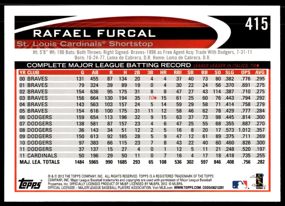 This Baseball card, from 2012 is part of the Topps card set. Rafael Furcal is featured and has a card number of 415.