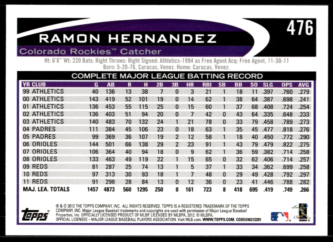 This Baseball card, from 2012 is part of the Topps card set. Ramon Hernandez is featured and has a card number of 476.