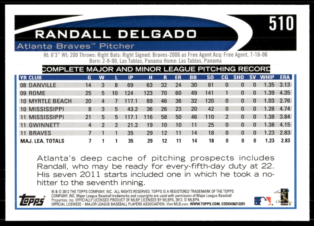 This Baseball card, from 2012 is part of the Topps card set. Randall Delgado is featured and has a card number of 510.