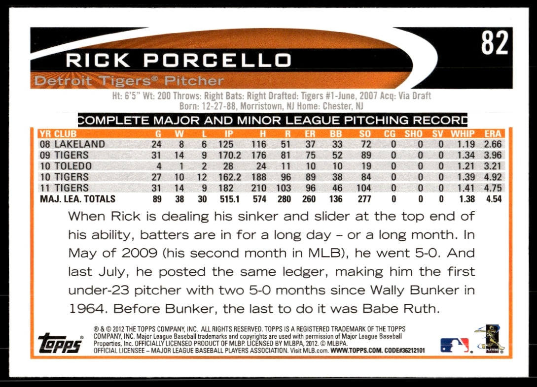This Baseball card, from 2012 is part of the Topps card set. Rick Porcello is featured and has a card number of 82.