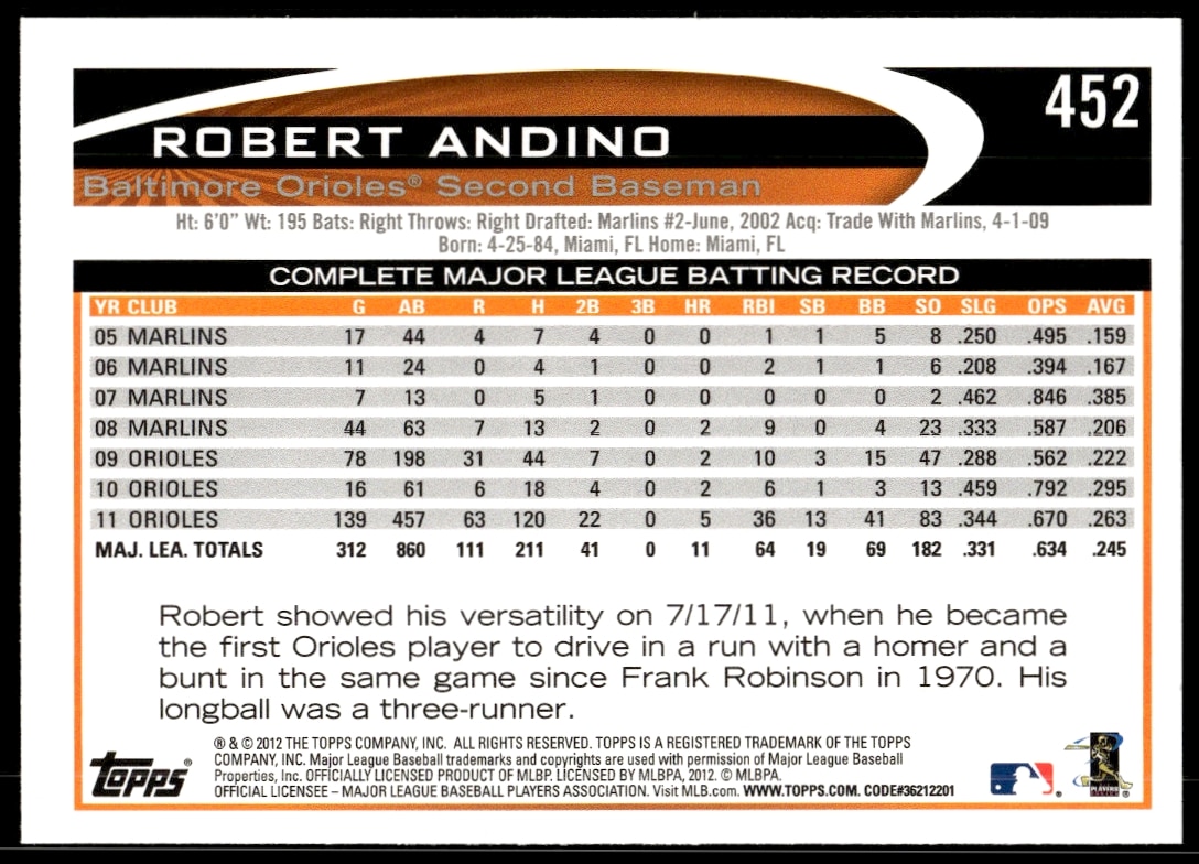 This Baseball card, from 2012 is part of the Topps card set. Robert Andino is featured and has a card number of 452.