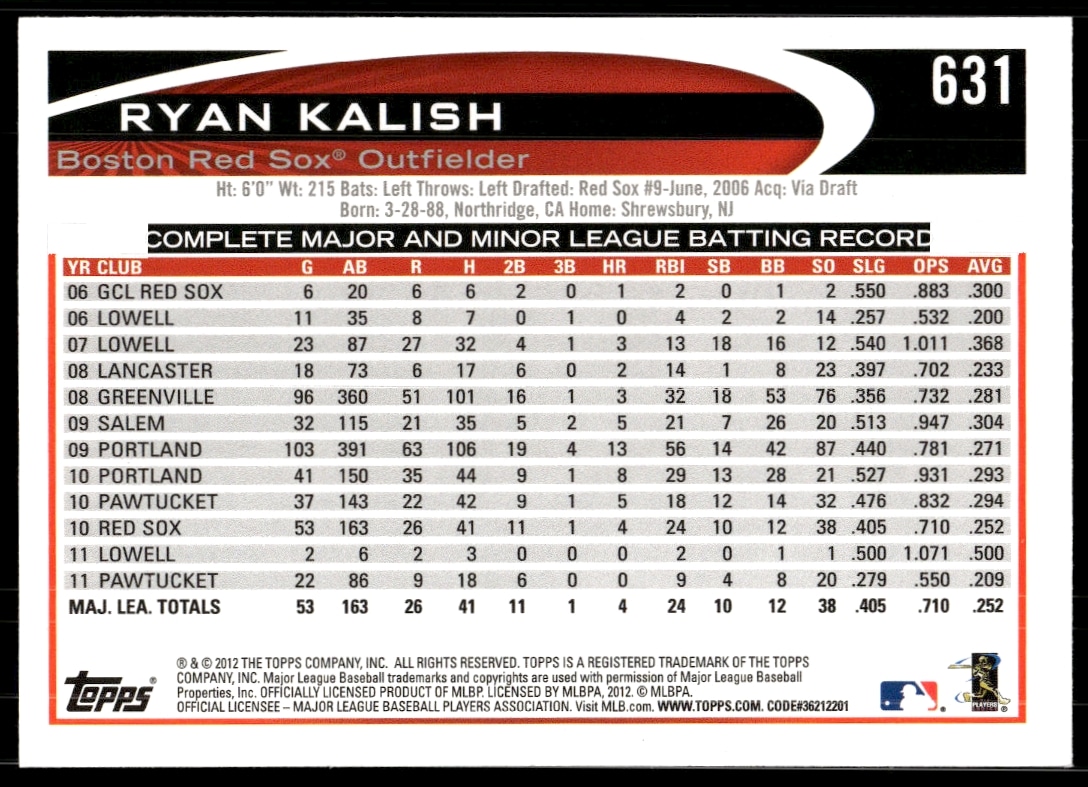 This Baseball card, from 2012 is part of the Topps card set. Ryan Kalish is featured and has a card number of 631.