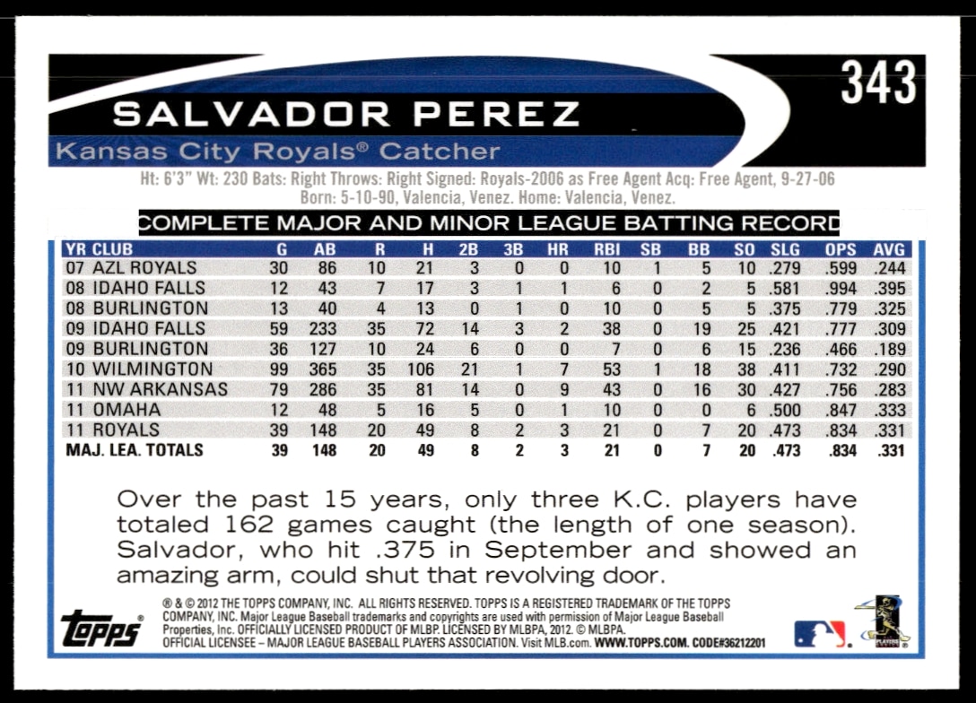 This Baseball card, from 2012 is part of the Topps card set. Salvador Perez is featured and has a card number of 343.