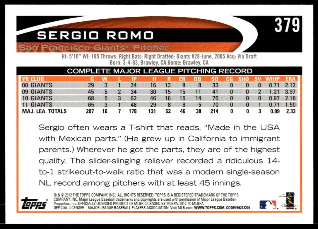 This Baseball card, from 2012 is part of the Topps card set. Sergio Romo is featured and has a card number of 379.