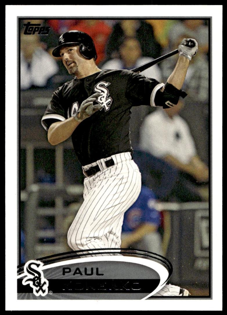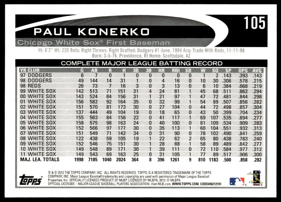 This Baseball card, from 2012 is part of the Topps Series 1 card set. Paul Konerko is featured and has a card number of 105.