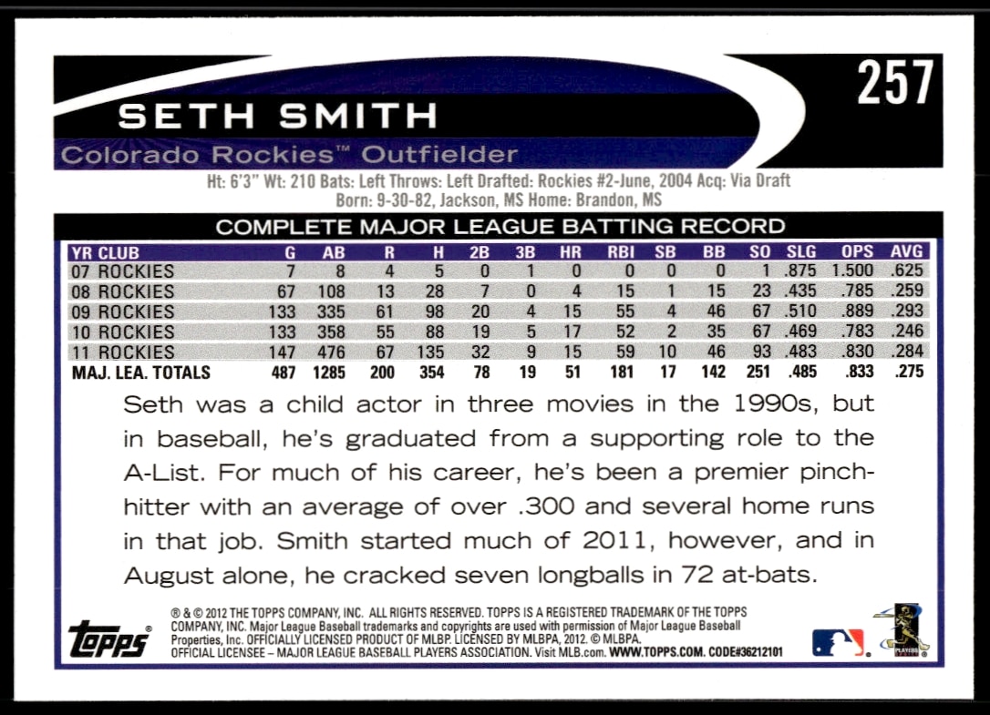 This Baseball card, from 2012 is part of the Topps card set. Seth Smith is featured and has a card number of 257.