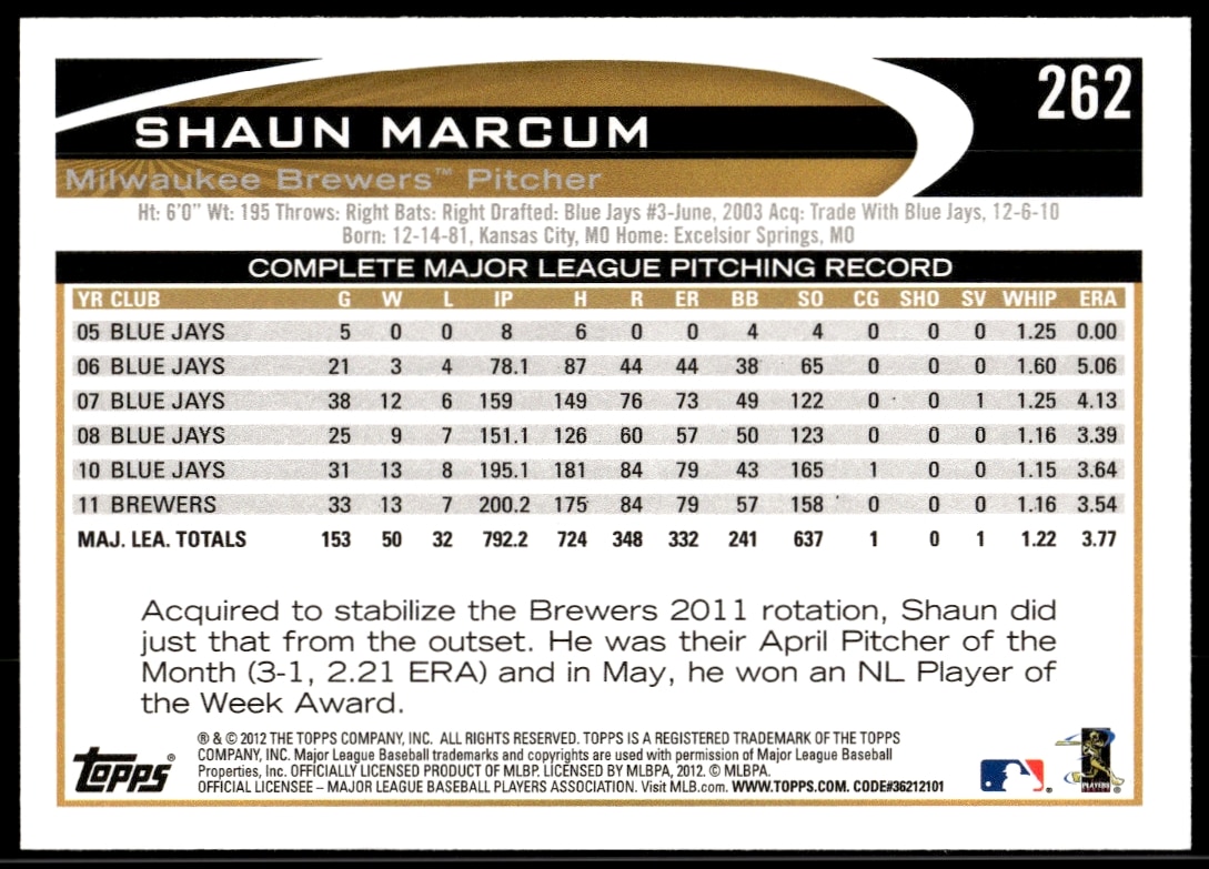 This Baseball card, from 2012 is part of the Topps card set. Shaun Marcum is featured and has a card number of 262.
