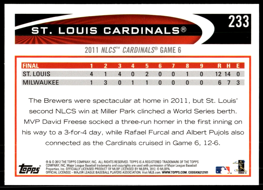 This Baseball card, from 2012 is part of the Topps card set. St. Louis Cardinals is featured and has a card number of 233.