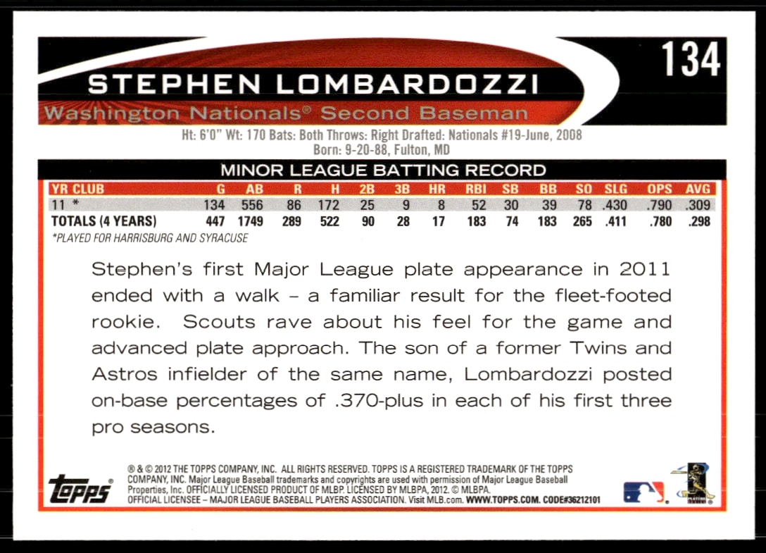 This Baseball card, from 2012 is part of the Topps card set. Steve Lombardozzi is featured and has a card number of 134.