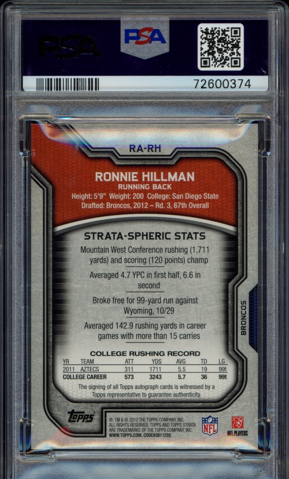 This Football card, from 2012 is part of the Topps Strata card set. Ronnie Hillman is featured and has a card number of RA-RH. It is graded by PSA and has a numeric grade of 8.