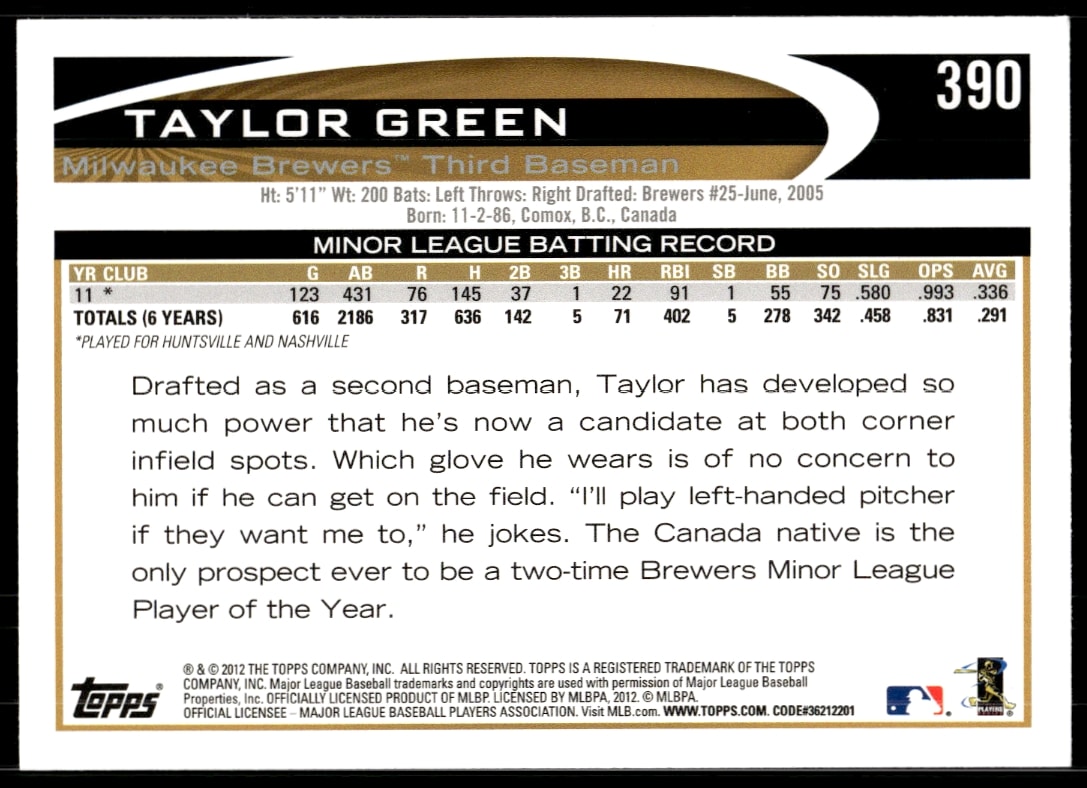 This Baseball card, from 2012 is part of the Topps card set. Taylor Green is featured and has a card number of 390.