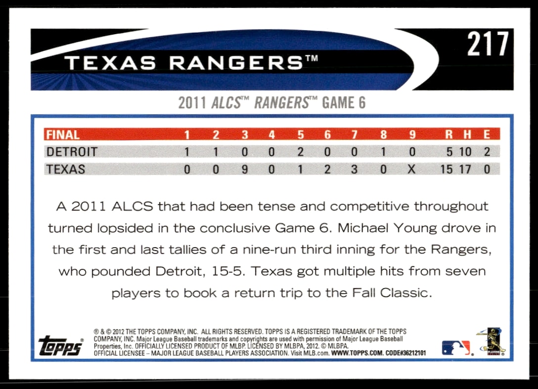 This Baseball card, from 2012 is part of the Topps card set. Texas Rangers is featured and has a card number of 217.