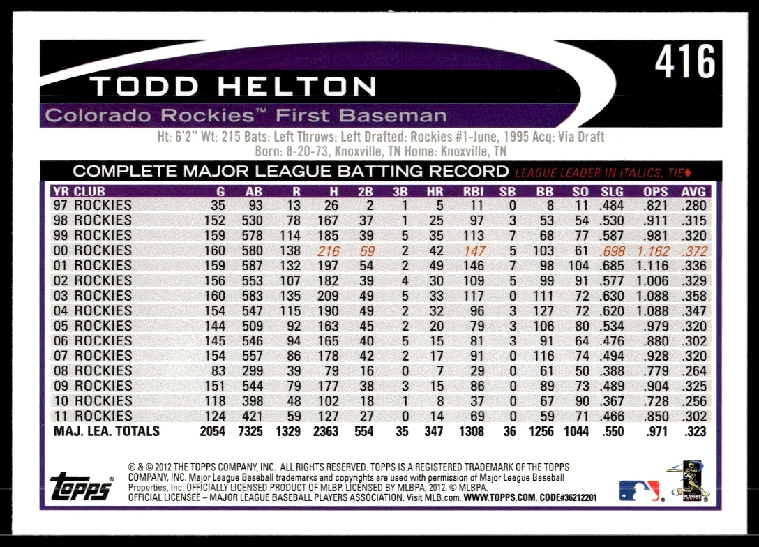 This Baseball card, from 2012 is part of the Topps card set. Todd Helton is featured and has a card number of 416.