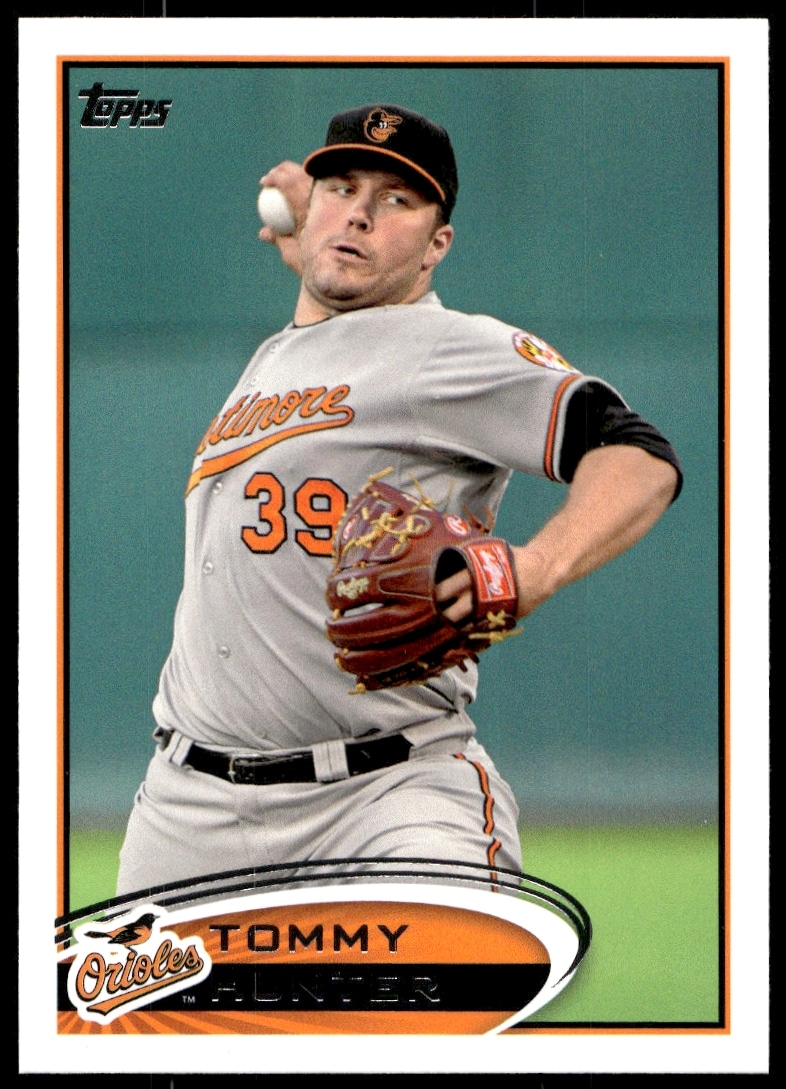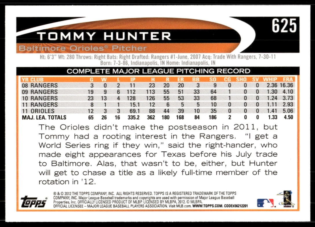 This Baseball card, from 2012 is part of the Topps card set. Tommy Hunter is featured and has a card number of 625.