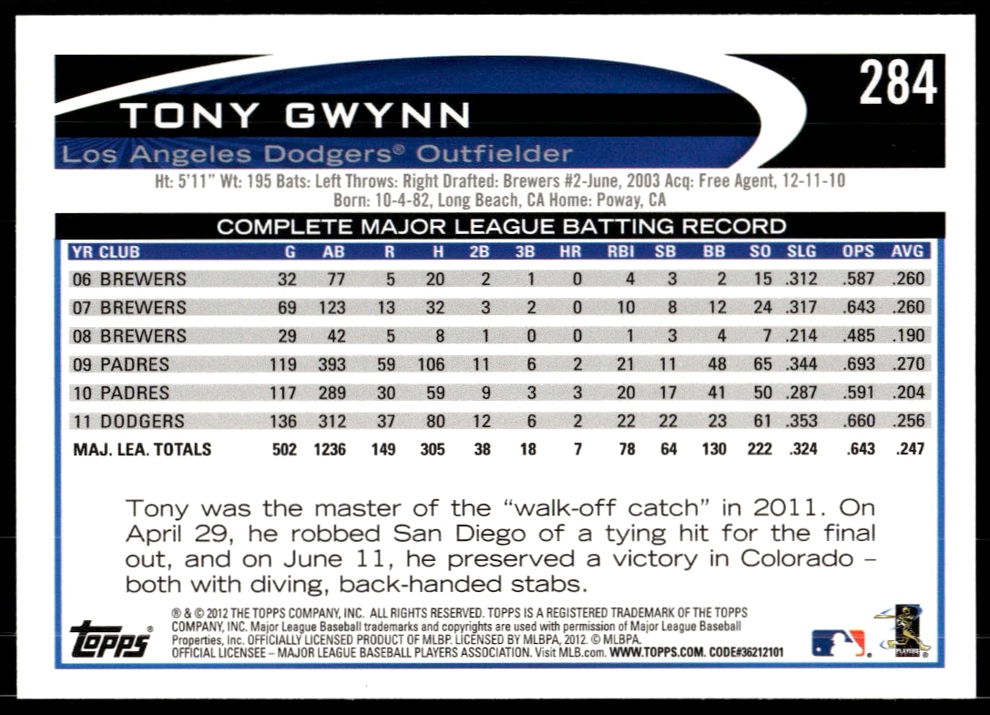 This Baseball card, from 2012 is part of the Topps card set. Tony Gwynn Jr. is featured and has a card number of 284.