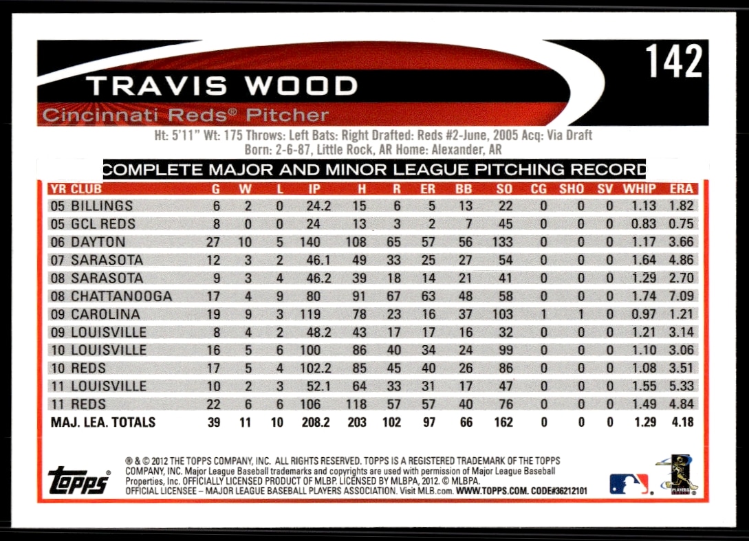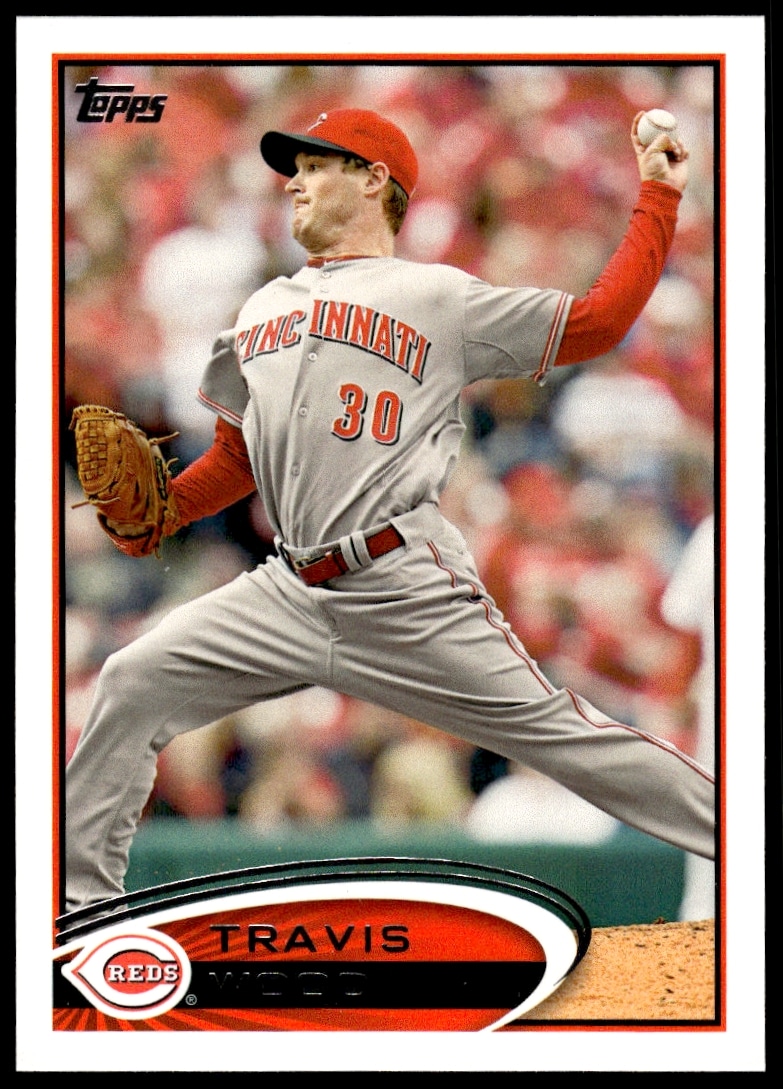 This Baseball card, from 2012 is part of the Topps card set. Travis Wood is featured and has a card number of 142.