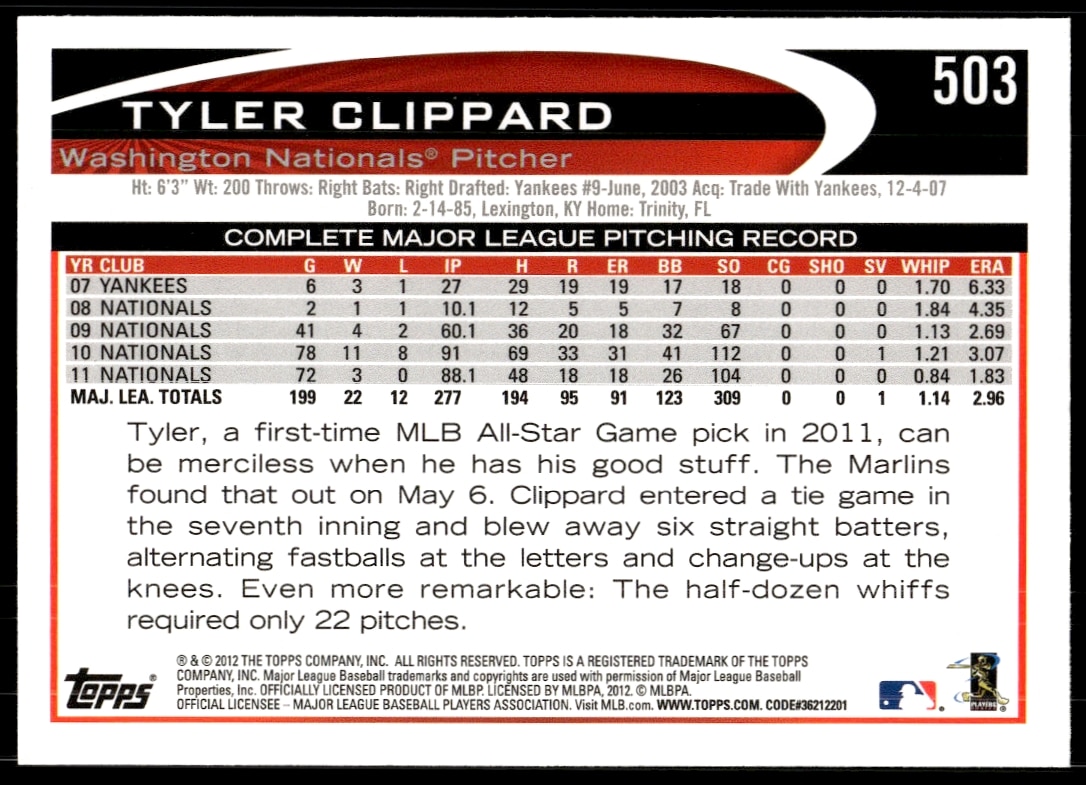 This Baseball card, from 2012 is part of the Topps card set. Tyler Clippard is featured and has a card number of 503.