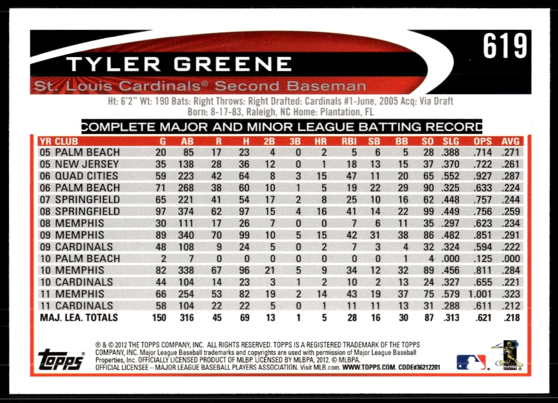This Baseball card, from 2012 is part of the Topps card set. Tyler Greene is featured and has a card number of 619.