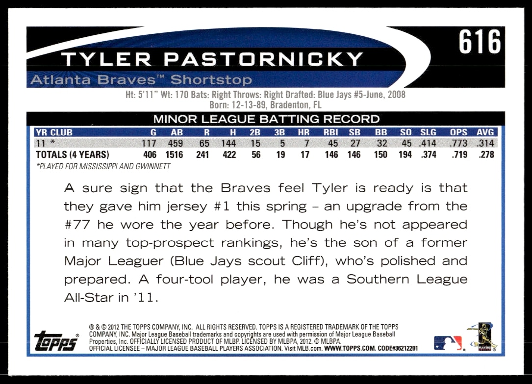 This Baseball card, from 2012 is part of the Topps card set. Tyler Pastornicky is featured and has a card number of 616.