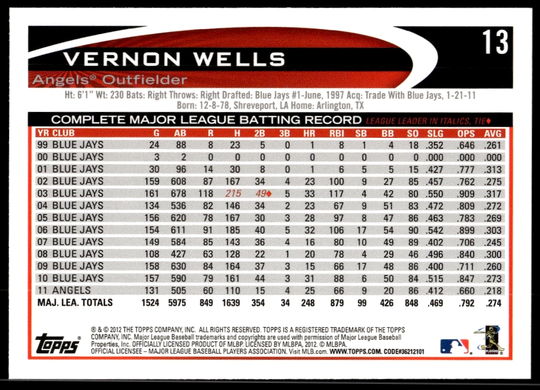 This Baseball card, from 2012 is part of the Topps card set. Vernon Wells is featured and has a card number of 13.
