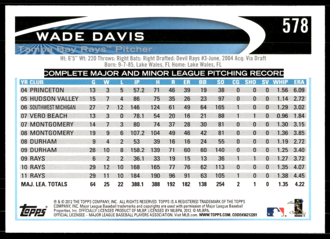 This Baseball card, from 2012 is part of the Topps card set. Wade Davis is featured and has a card number of 578.