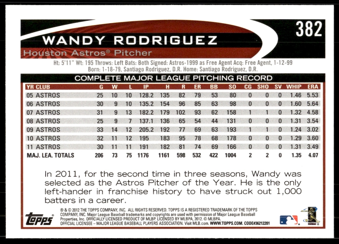 This Baseball card, from 2012 is part of the Topps card set. Wandy Rodriguez is featured and has a card number of 382.