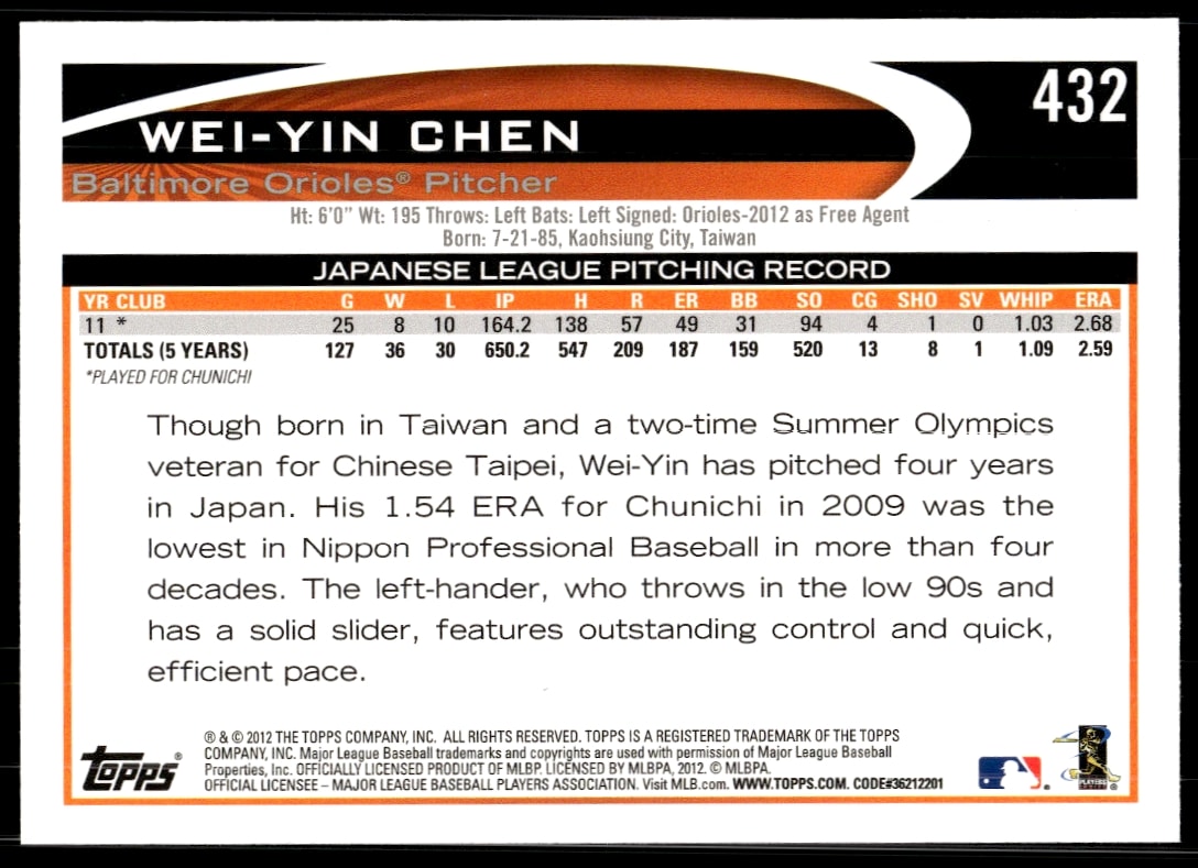 This Baseball card, from 2012 is part of the Topps card set. Wei-Yin Chen is featured and has a card number of 432.