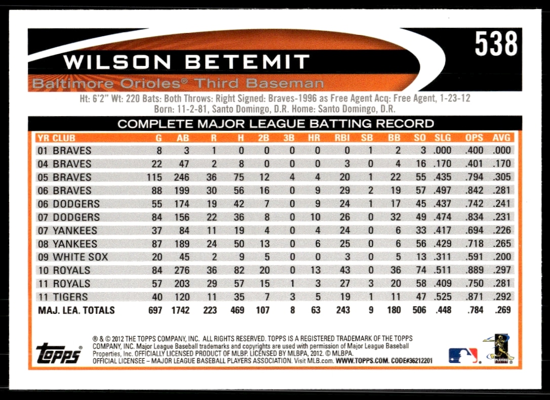 This Baseball card, from 2012 is part of the Topps card set. Wilson Betemit is featured and has a card number of 538.