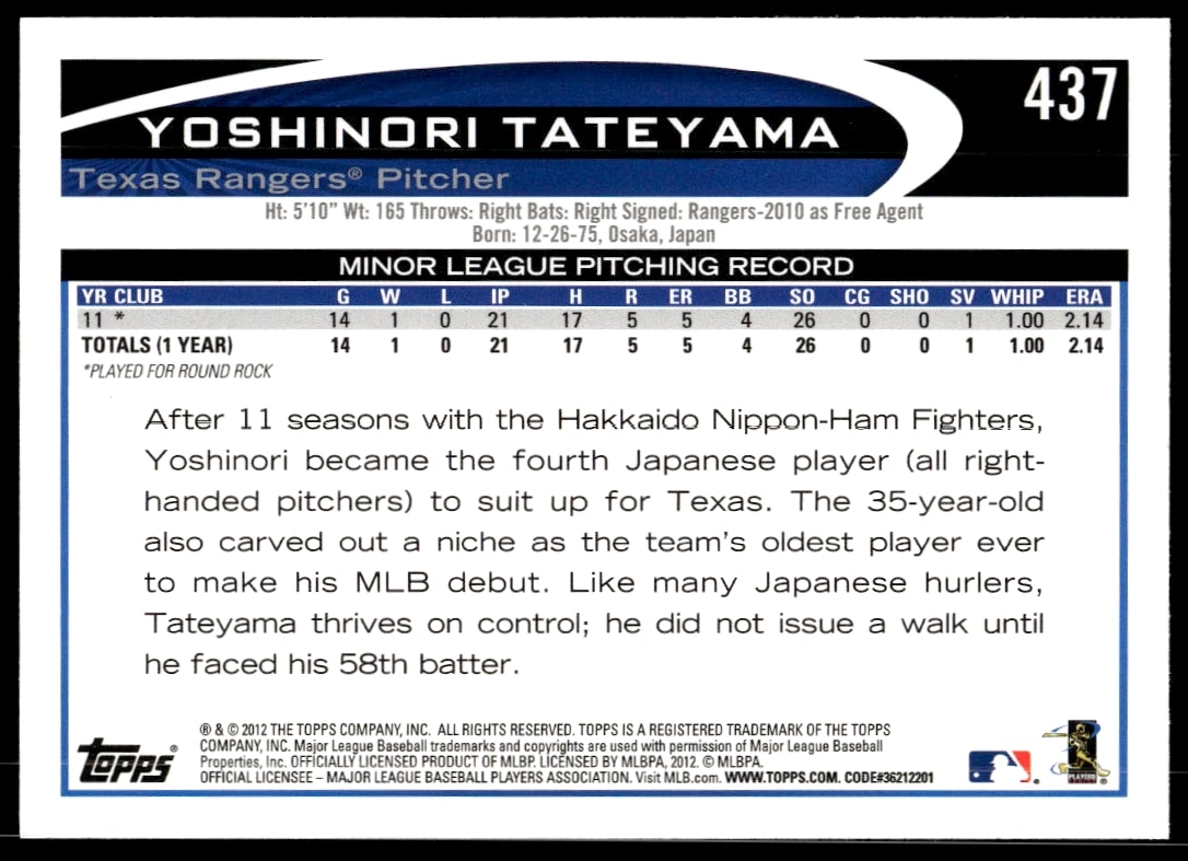 This Baseball card, from 2012 is part of the Topps card set. Yoshinori Tateyama is featured and has a card number of 437.