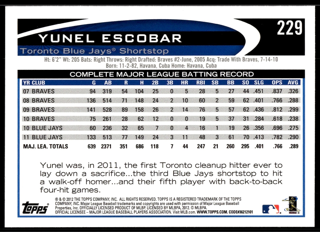This Baseball card, from 2012 is part of the Topps card set. Yunel Escobar is featured and has a card number of 229.