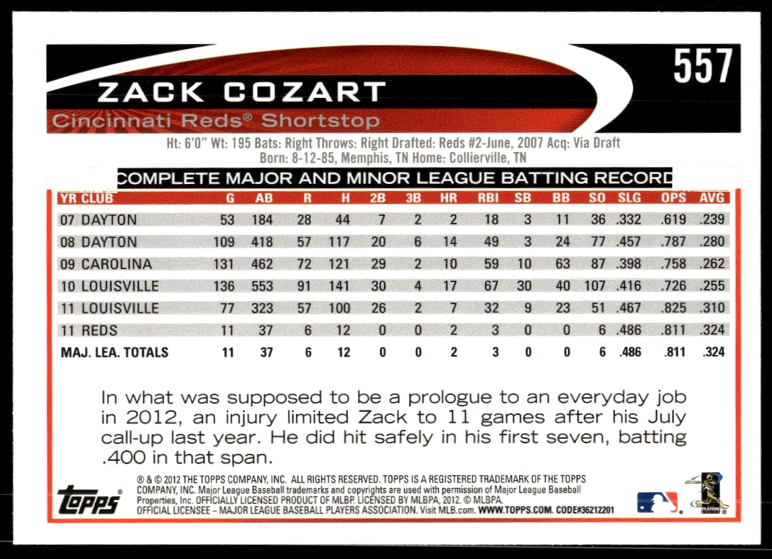 This Baseball card, from 2012 is part of the Topps card set. Zack Cozart is featured and has a card number of 557.