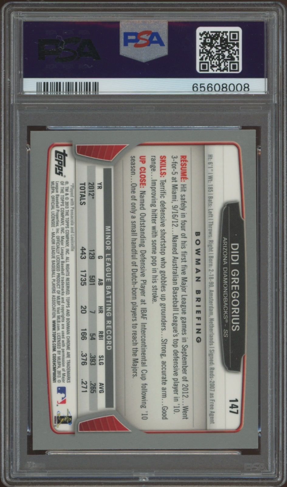 This Baseball card, from 2013 is part of the Bowman Chrome card set. Didi Gregorius is featured and has a card number of 147. It is graded by PSA and has a numeric grade of 10.