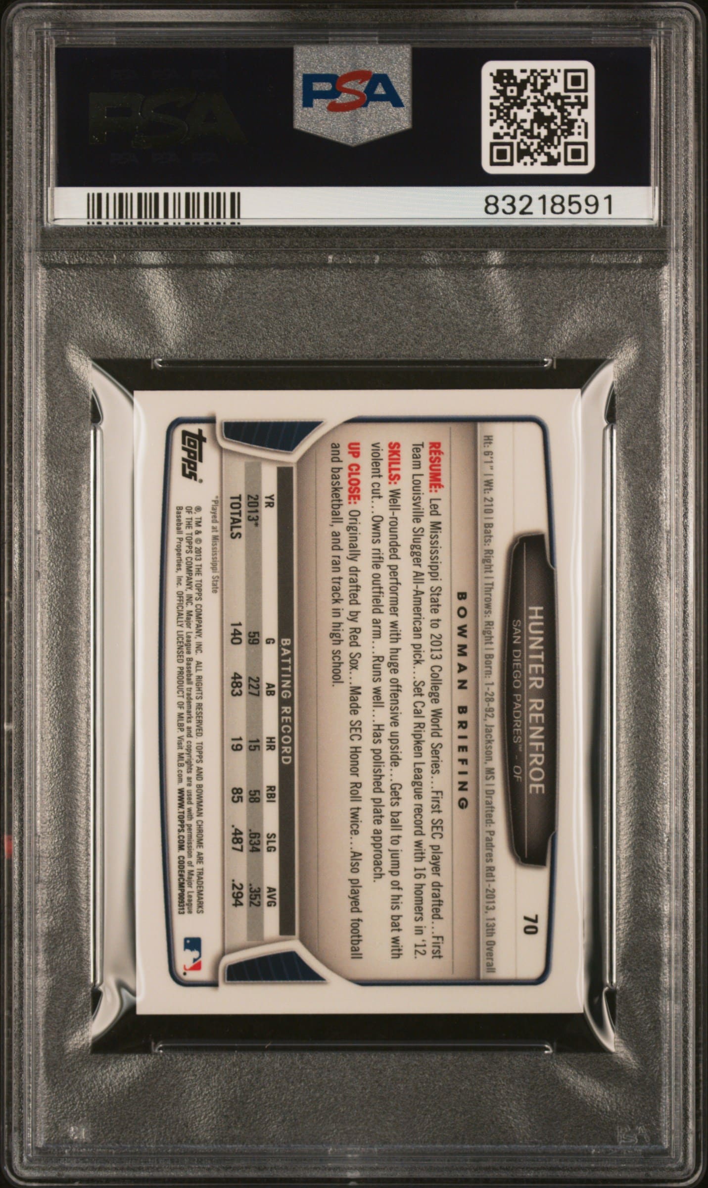 This Baseball card, from 2013 is part of the Bowman Chrome card set. Hunter Renfroe is featured and has a card number of 70. It is graded by PSA and has a numeric grade of 10.