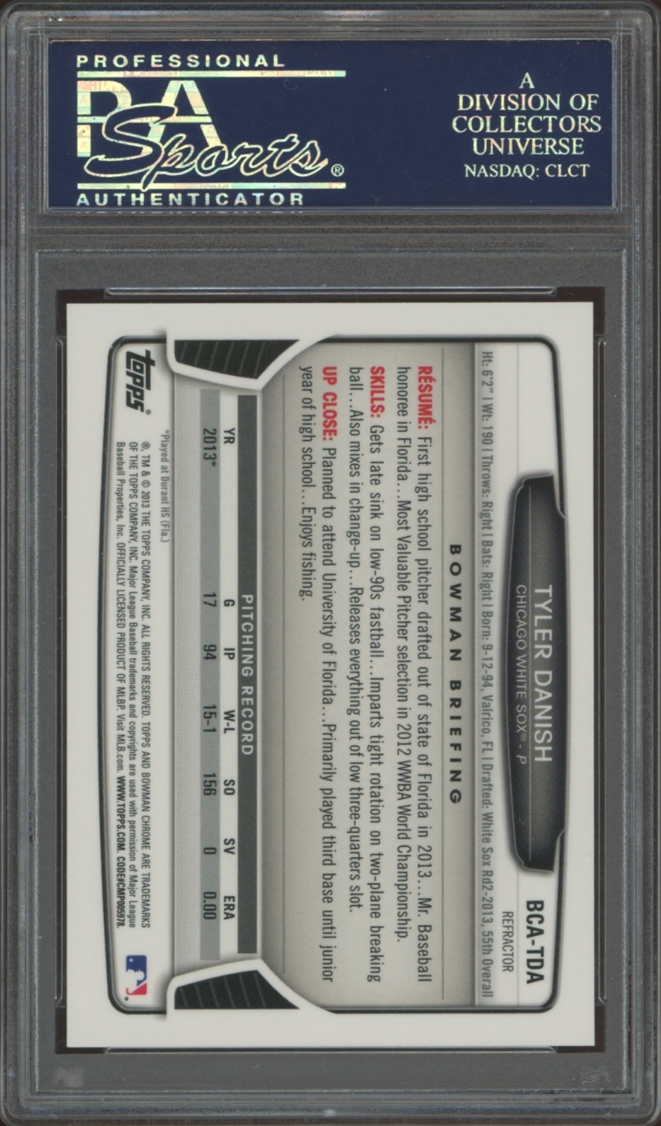 This Baseball card, from 2013 is part of the Bowman Chrome card set. Tyler Danish is featured and has a card number of BCA-TDA. It is graded by PSA and has a numeric grade of 10.