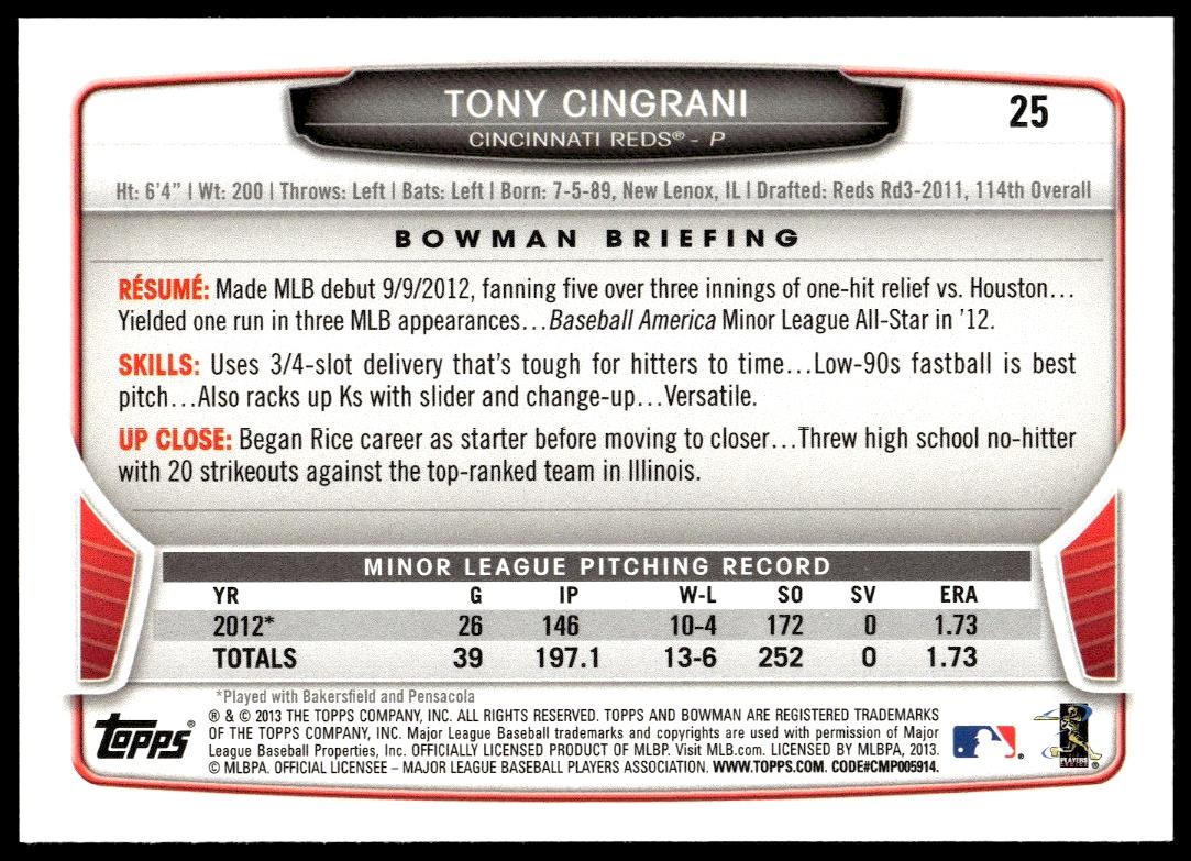 This Baseball card, from 2013 is part of the Bowman Draft Picks & Prospects card set. Tony Cingrani is featured and has a card number of 25.