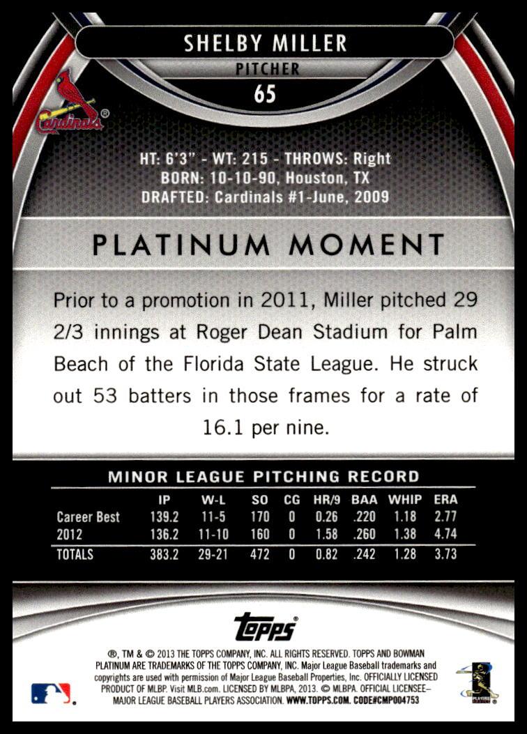 This Baseball card, from 2013 is part of the Topps Allen & Ginter card set. Shelby Miller is featured and has a card number of ATY-SM.
