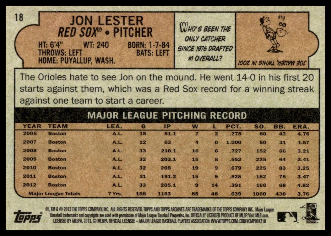 This Baseball card, from 2013 is part of the Topps Archives card set. Jon Lester is featured and has a card number of 18.