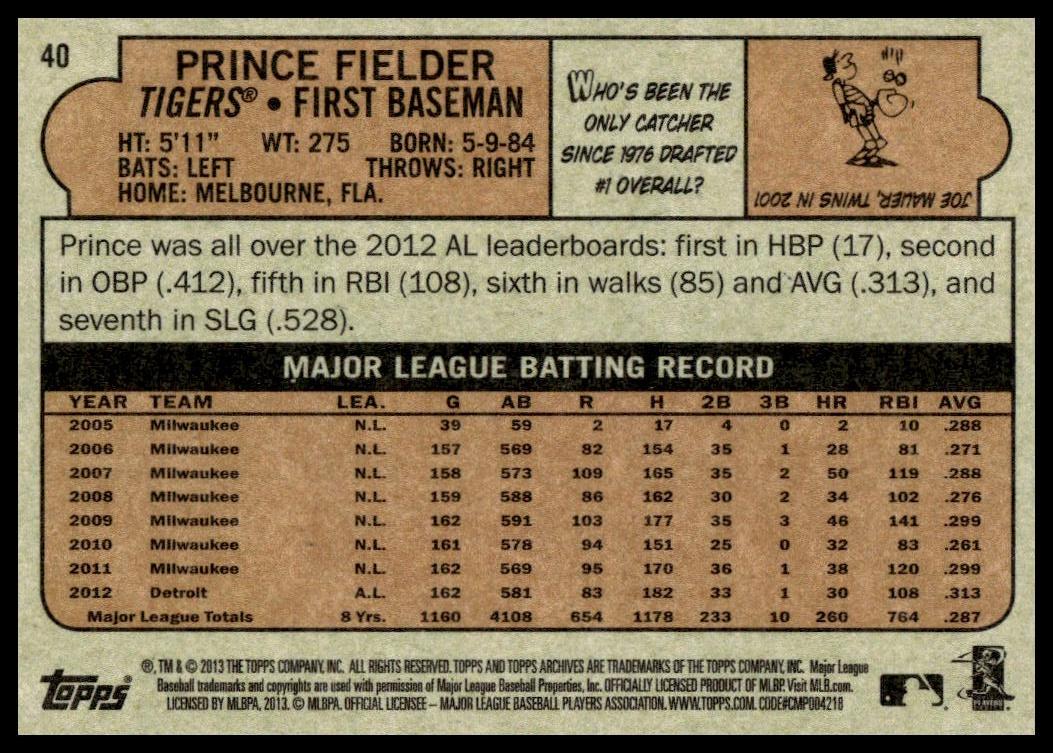 This Baseball card, from 2013 is part of the Topps Archives card set. Prince Fielder is featured and has a card number of 40.
