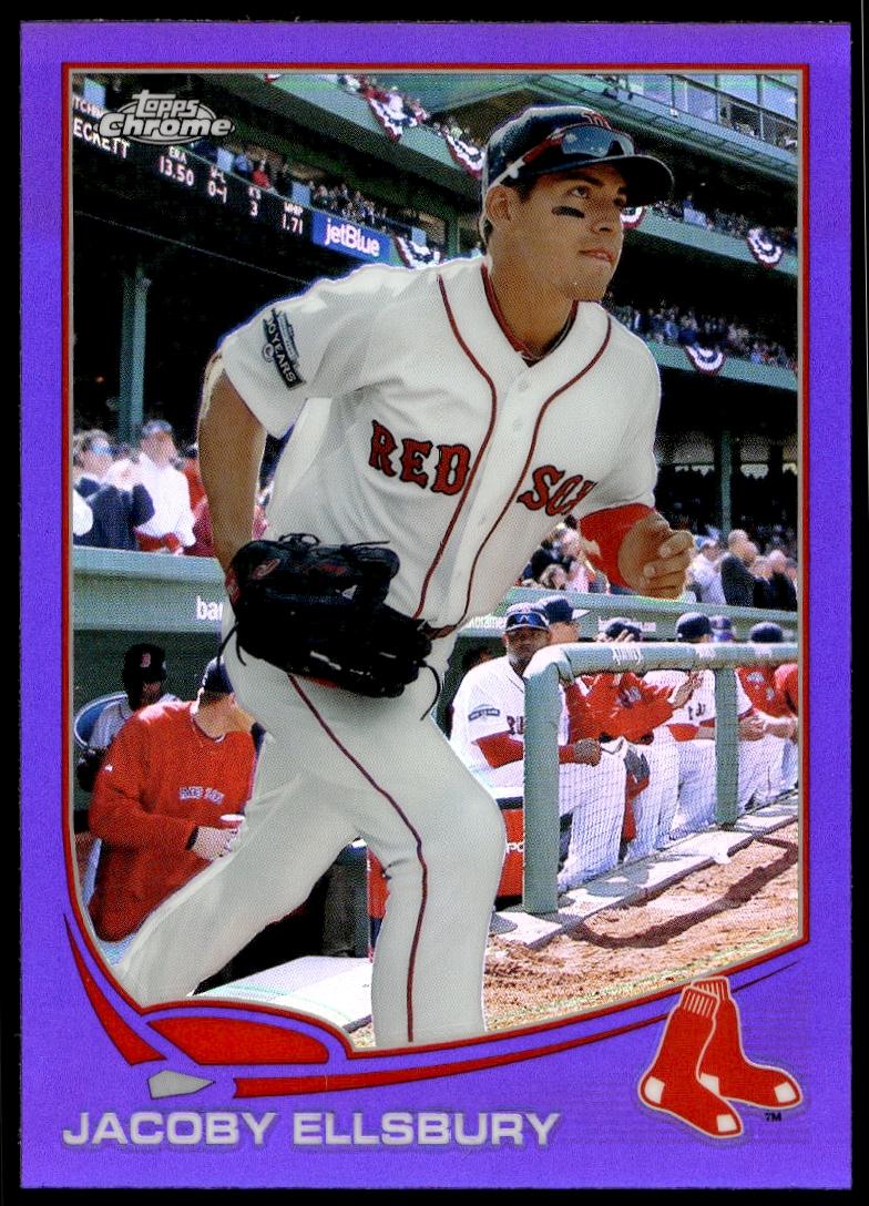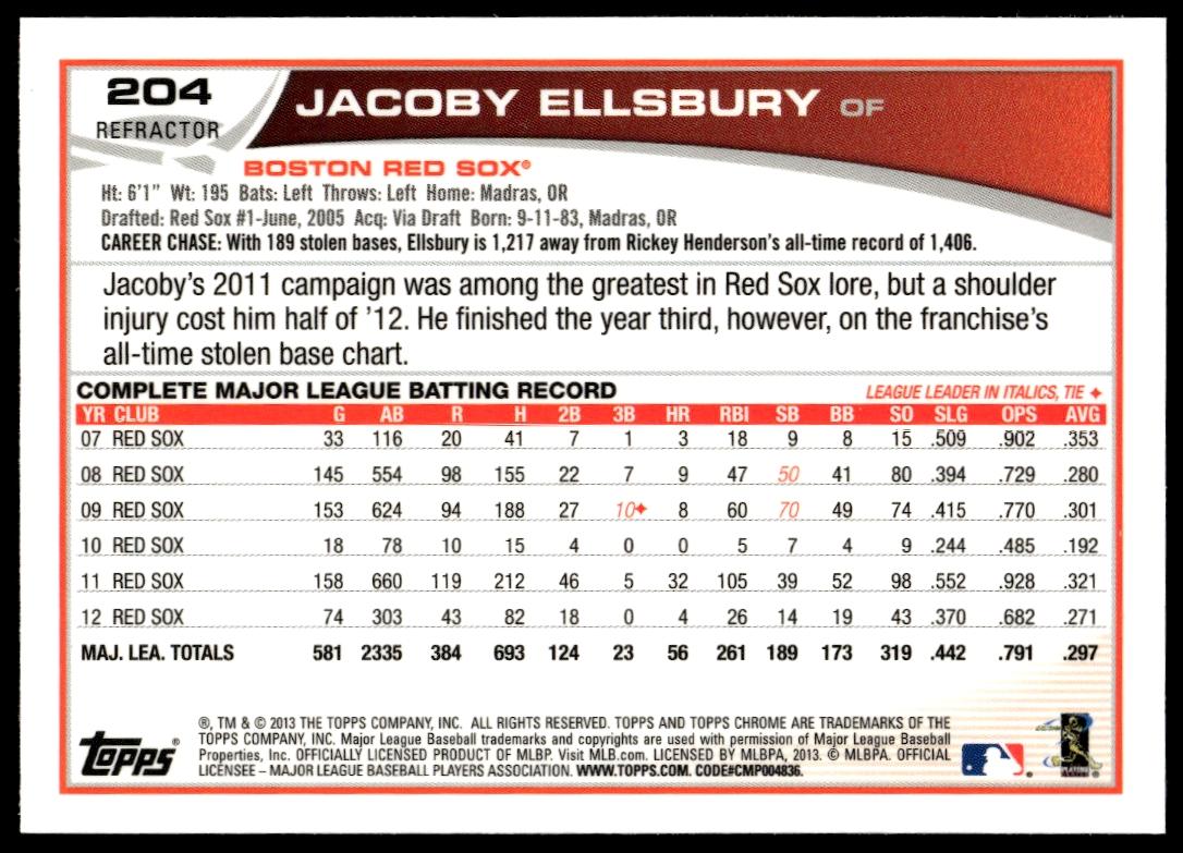 This Baseball card, from 2013 is part of the Topps Chrome card set. Jacoby Ellsbury is featured and has a card number of 204.