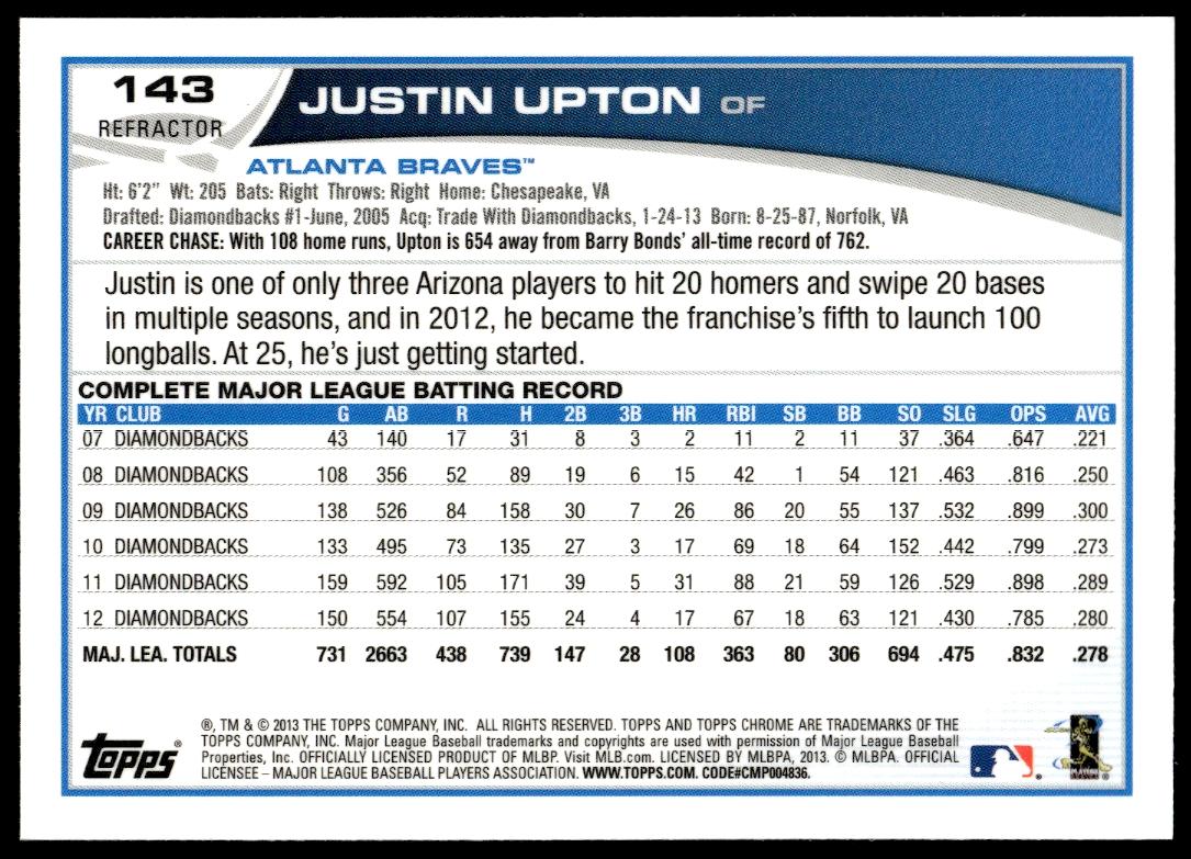 This Baseball card, from 2013 is part of the Topps Chrome card set. Justin Upton is featured and has a card number of 143.