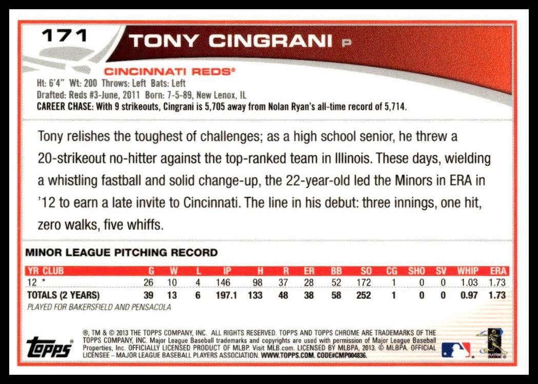 This Baseball card, from 2013 is part of the Topps Chrome card set. Tony Cingrani is featured and has a card number of 171.