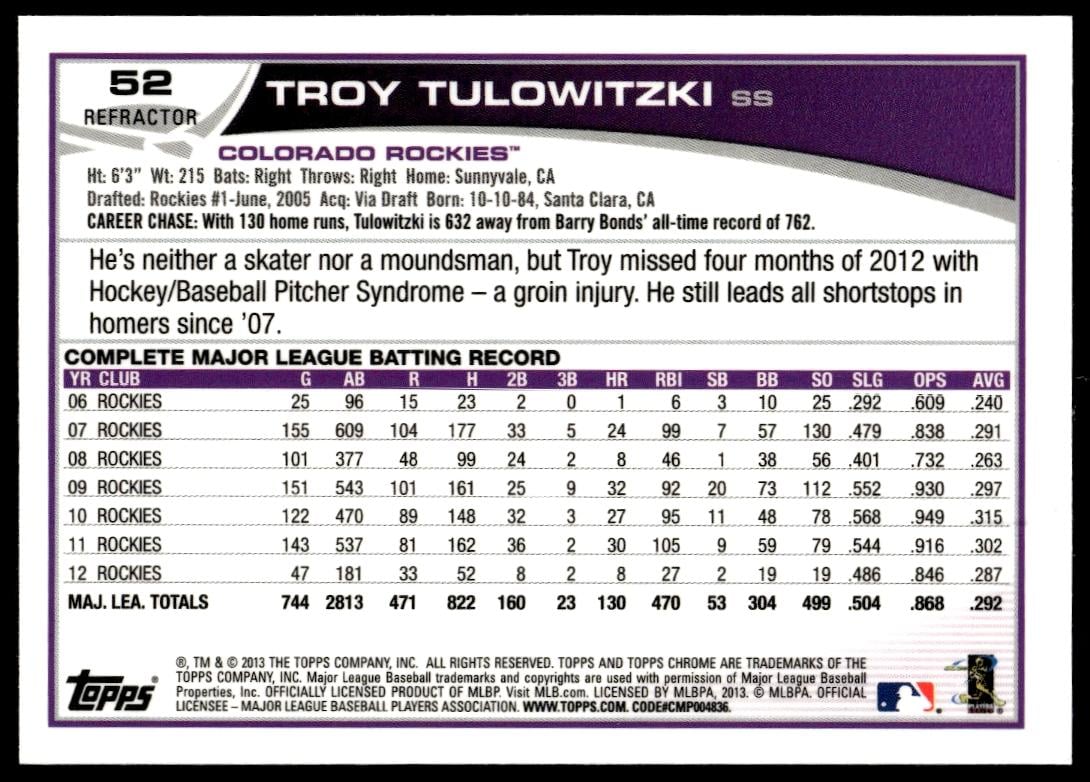 This Baseball card, from 2013 is part of the Topps Chrome card set. Troy Tulowitzki is featured and has a card number of 52.