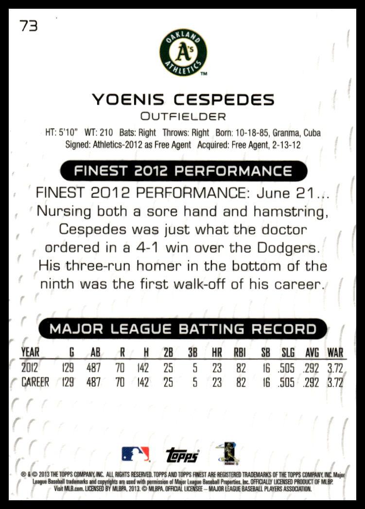 This BaseballΒ card, from 2013 is part of the Topps FinestΒ card set. Yoenis Cespedes is featured and has a card number of 73.