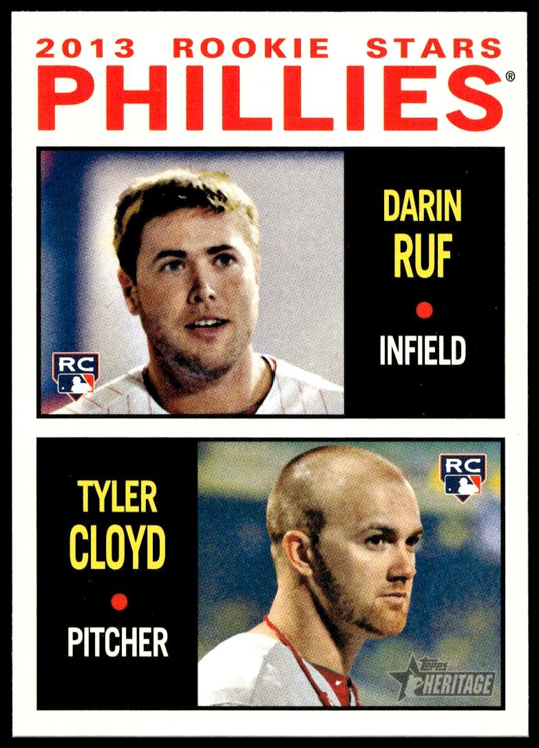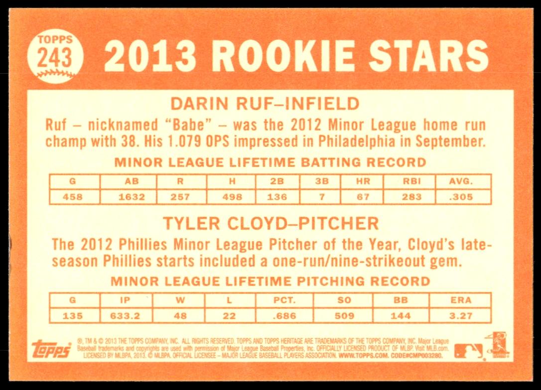 This Baseball card, from 2013 is part of the Topps Heritage card set. Darin Ruf / Tyler Cloyd is featured and has a card number of 243.