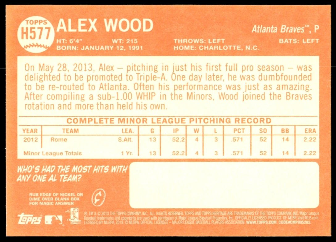 This Baseball card, from 2013 is part of the Topps Heritage High Number card set. Alex Wood is featured and has a card number of H577.