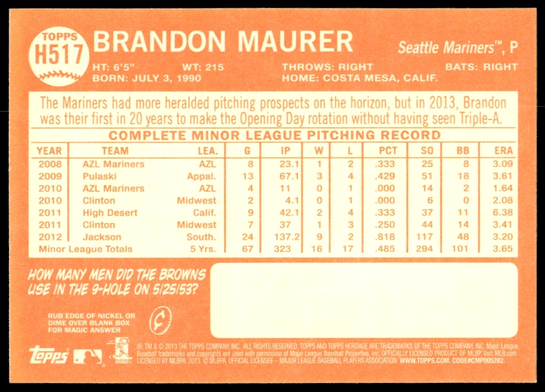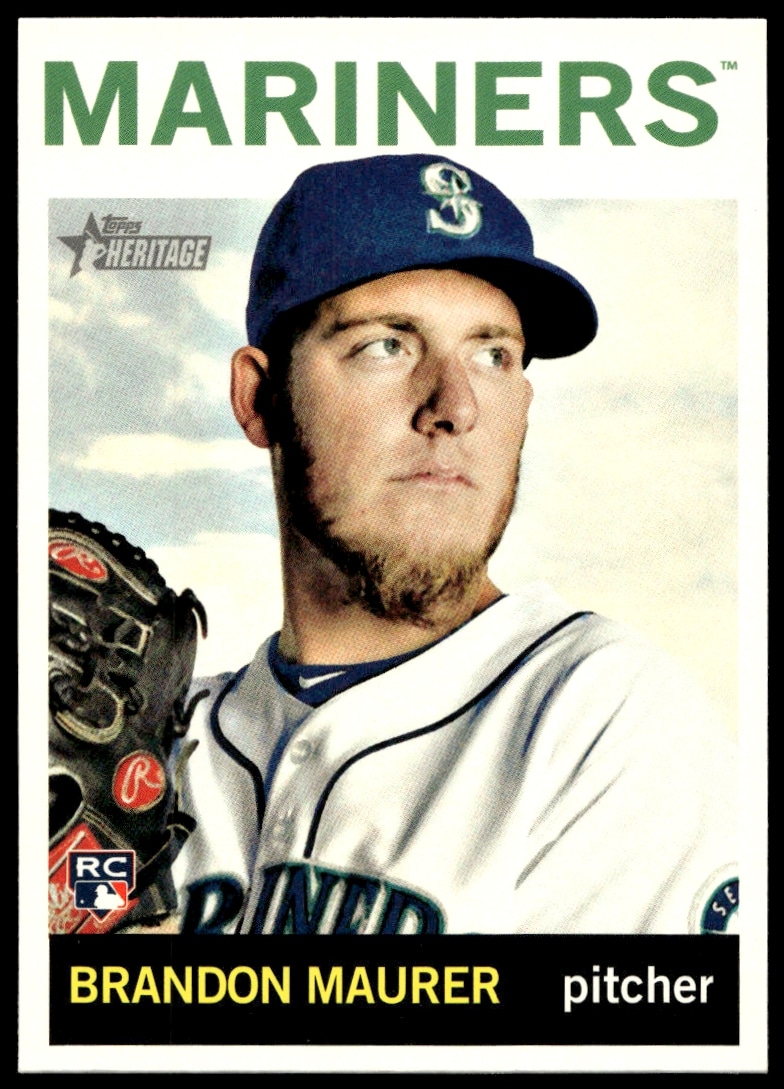 This Baseball card, from 2013 is part of the Topps Heritage High Number card set. Brandon Maurer is featured and has a card number of H517.