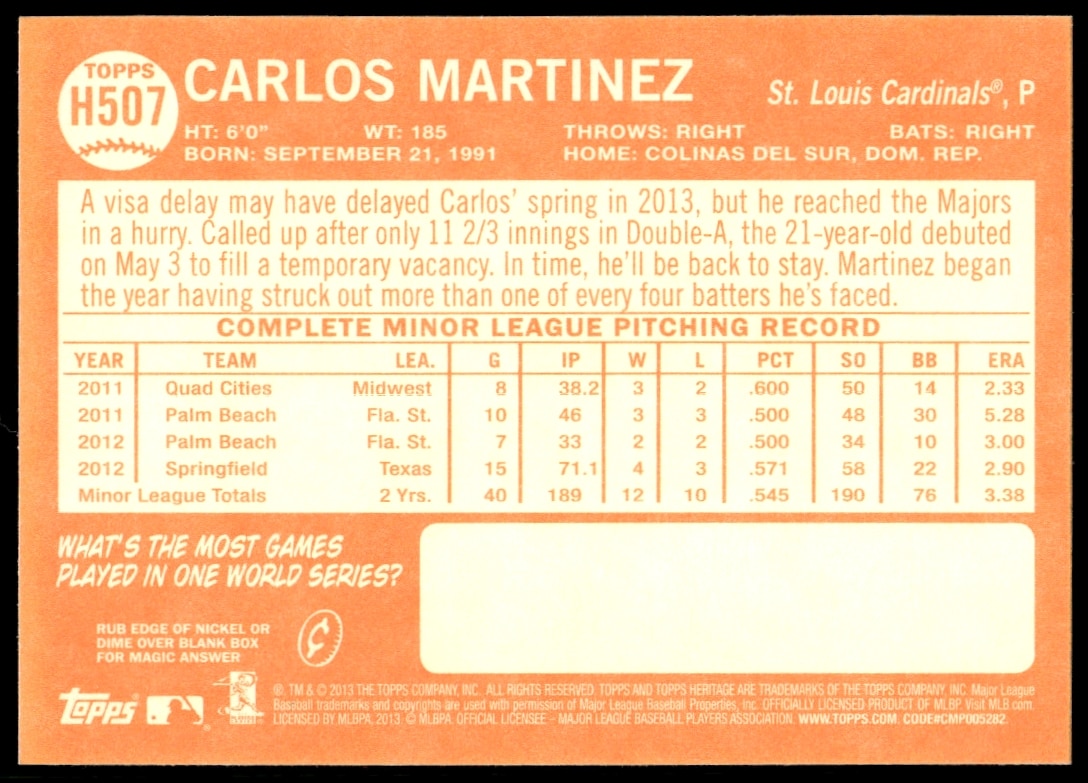 This Baseball card, from 2013 is part of the Topps Heritage High Number card set. Carlos Martinez is featured and has a card number of H507.
