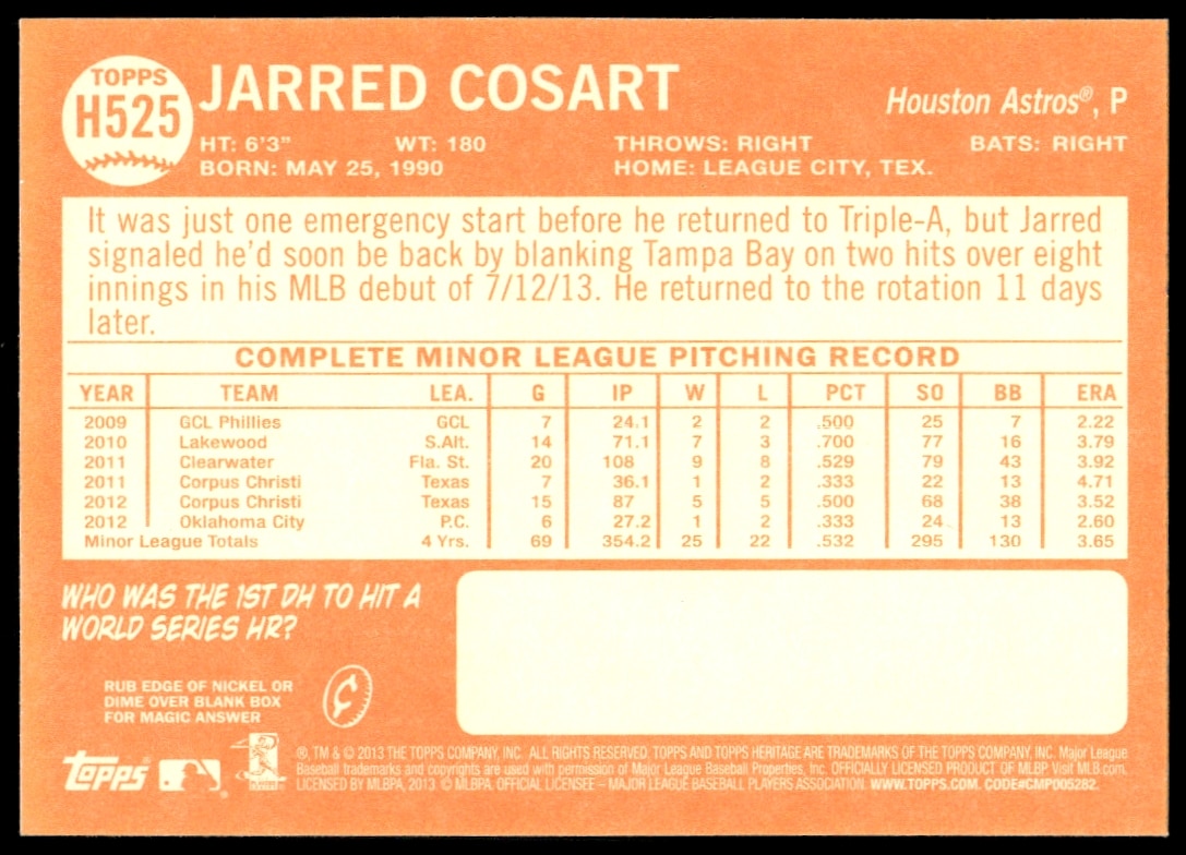 This Baseball card, from 2013 is part of the Topps Heritage High Number card set. Jarred Cosart is featured and has a card number of H525.