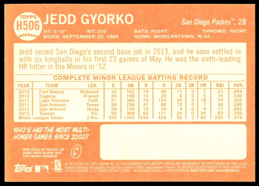 This Baseball card, from 2013 is part of the Topps Heritage High Number card set. Jedd Gyorko is featured and has a card number of H506.