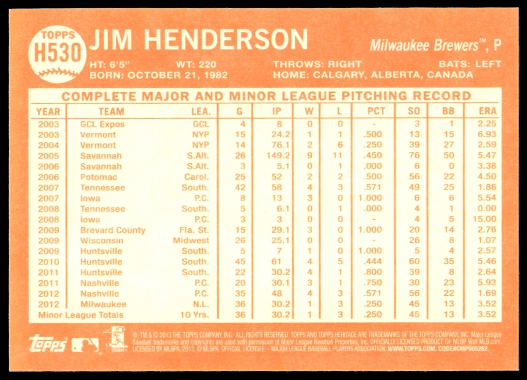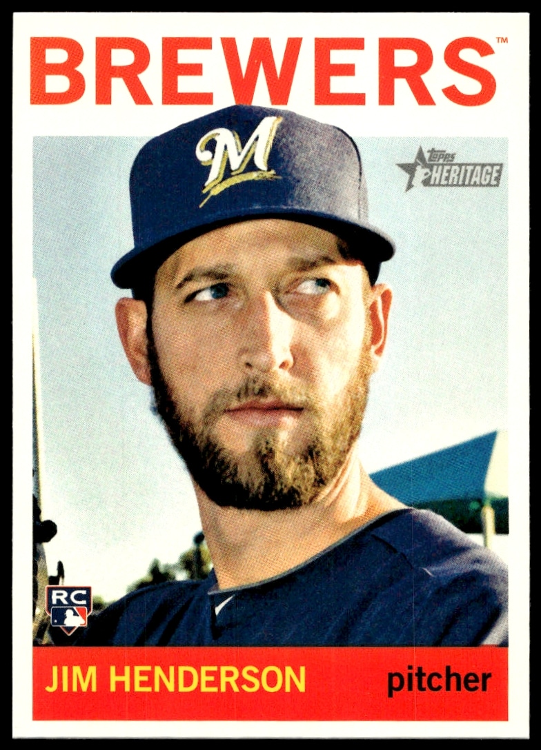 This Baseball card, from 2013 is part of the Topps Heritage High Number card set. Jim Henderson is featured and has a card number of H530.